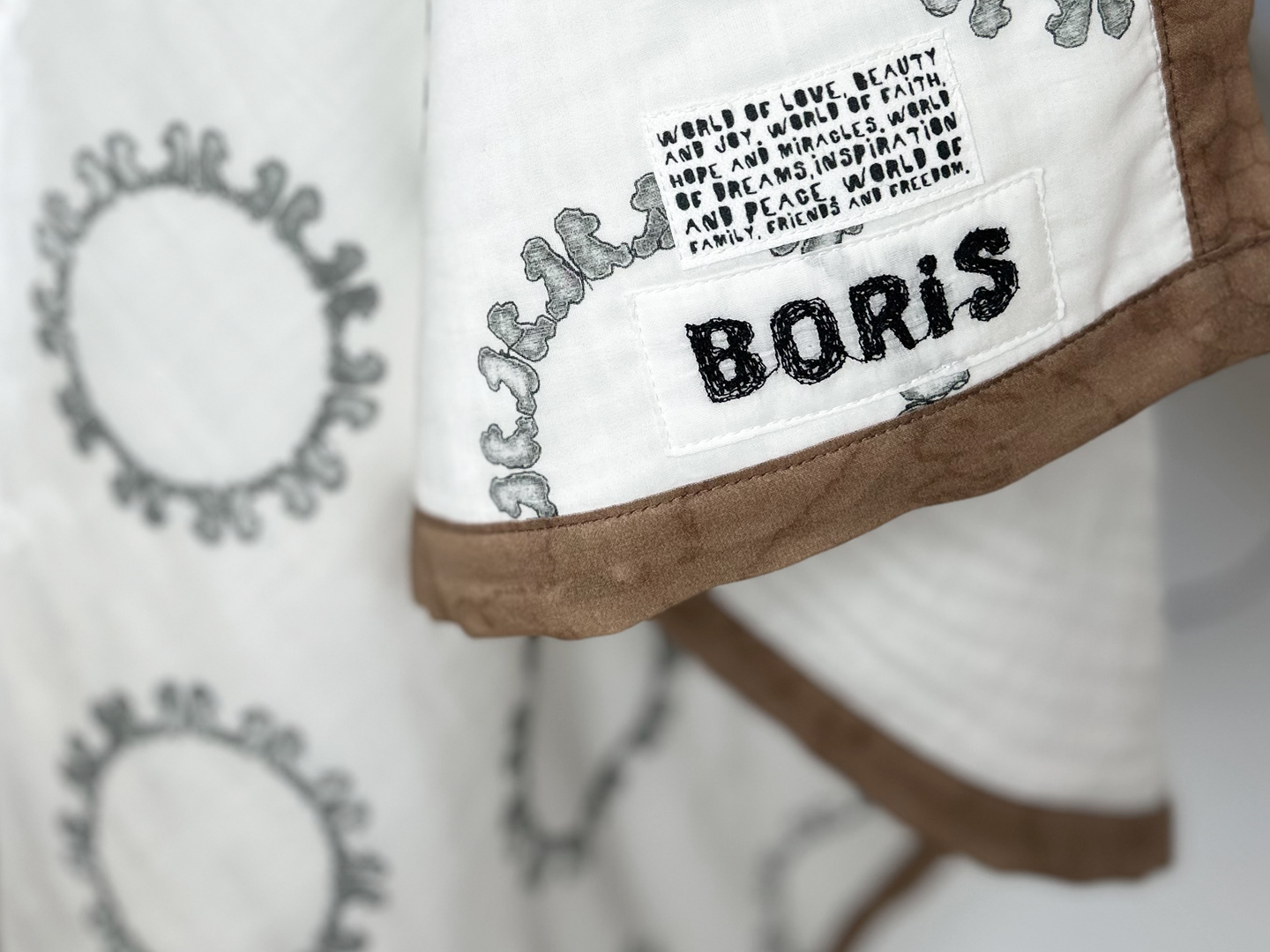 In oude culturen is het kiezen van een dier voor een pasgeborene een geliefde traditie. Als een symbool, als een totem, reist het dier met het kind mee. Op aanvraag ontwerp ik graag nieuwe dieren en patronen waar iemand een bijzondere verbinding mee heeft. Zo creëren we samen een persoonlijke cadeau voor de pasgeborene waar ook geborduurde details zoals naam en datum aan toegevoegd kunnen worden.