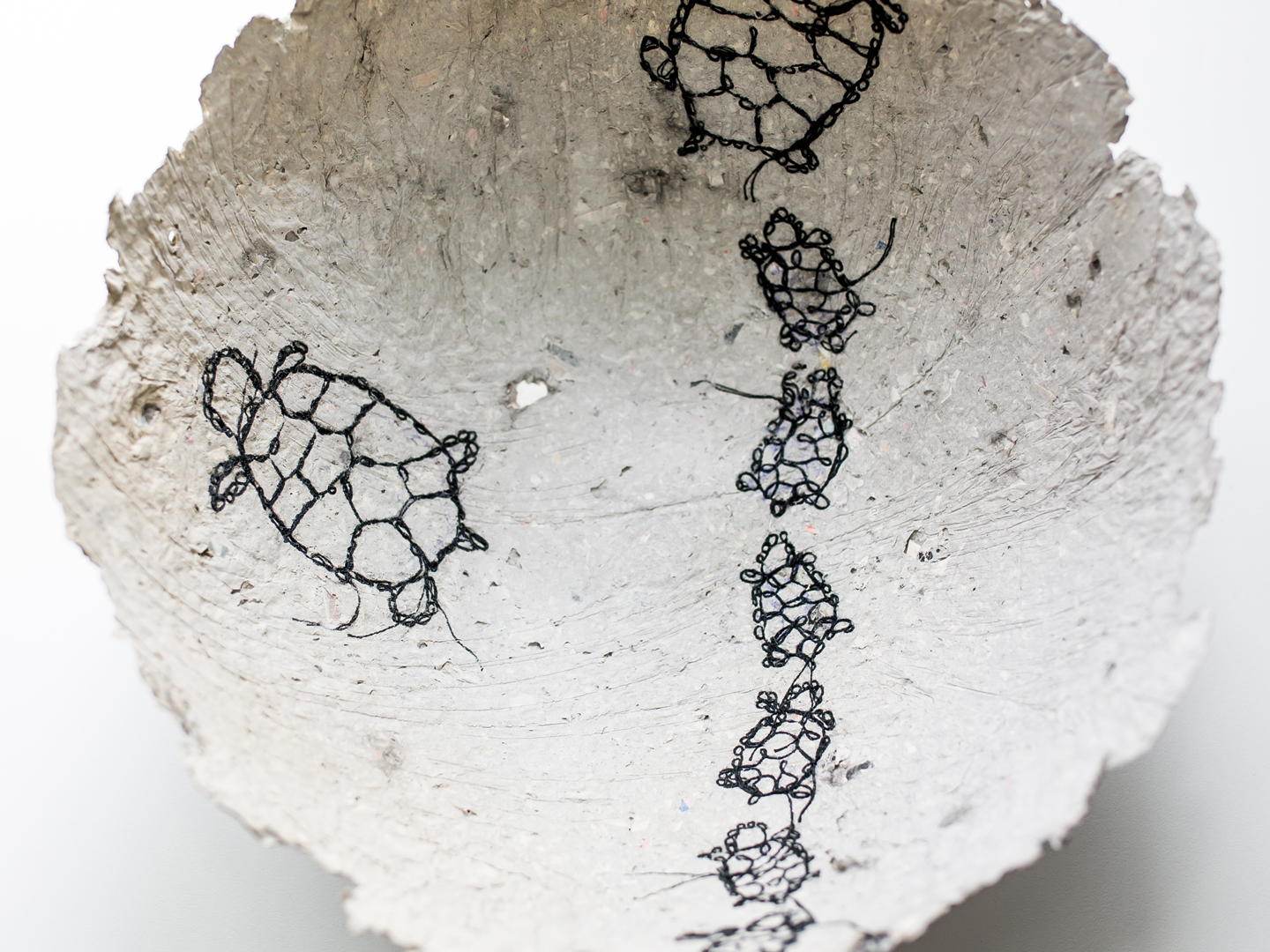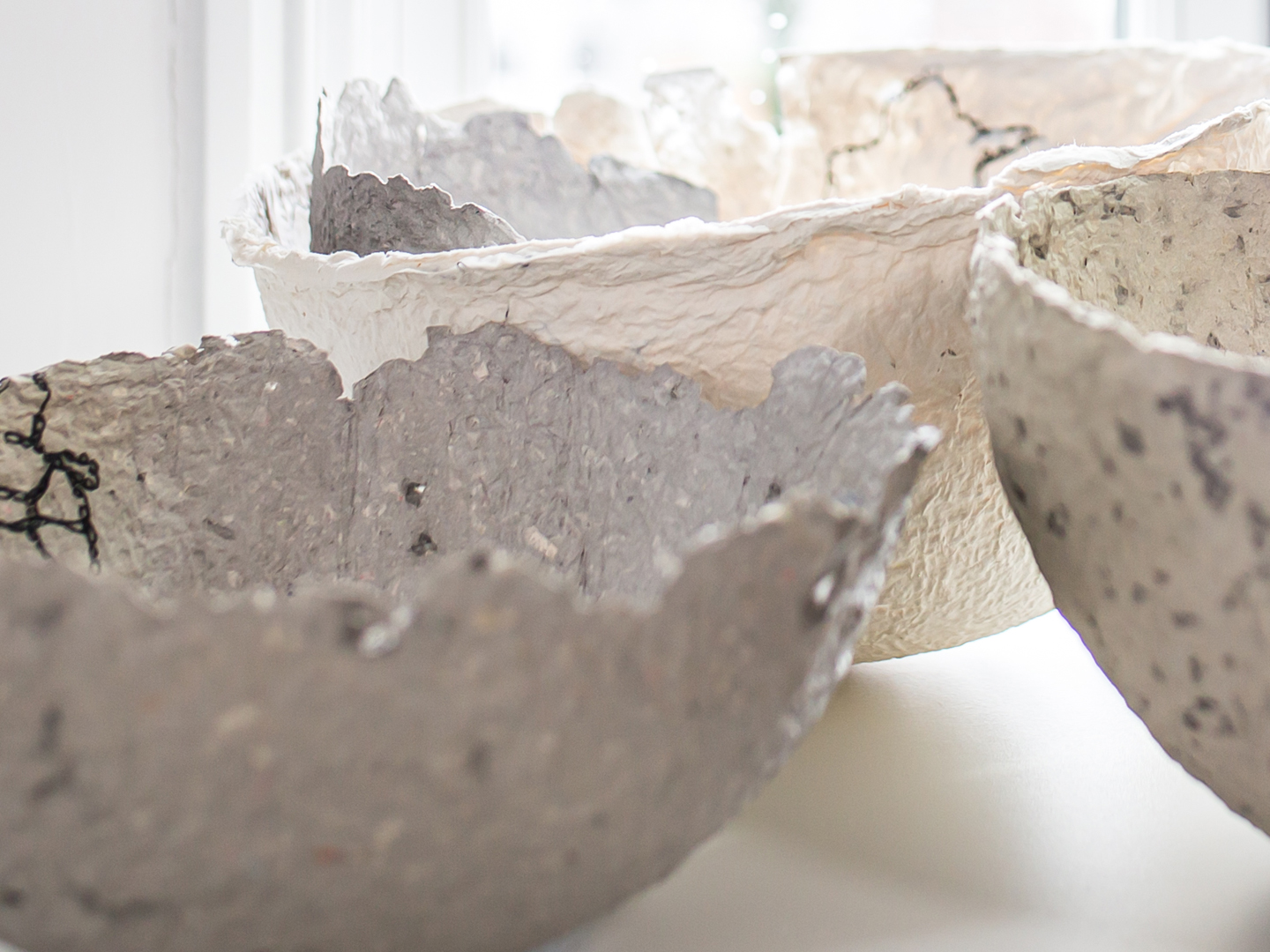 Papyr is een samensmelting van papier en borduurwerk. Ik maak pulp van allerlei verzamelde papiersoorten - van dagboeken en inspirerende tijdschriften tot belastingenveloppen. De ontwerpen worden geborduurd op wateroplosbare stof en wanneer deze elementen samenkomen vindt er een transformatie plaats. De stof lost op, de pulp verstevigt, en het delicate borduurwerk blijft over, naadloos versmolten met het papier zelf. Vezels en draden vormen een nieuwe eenheid.