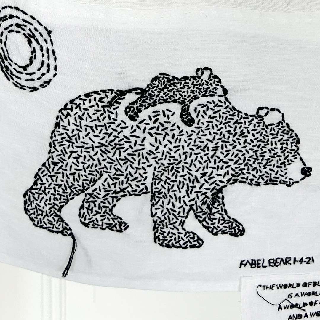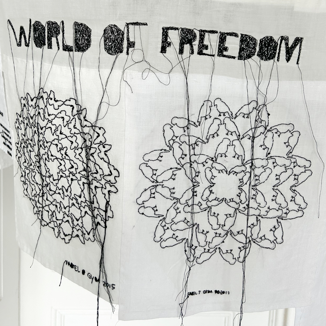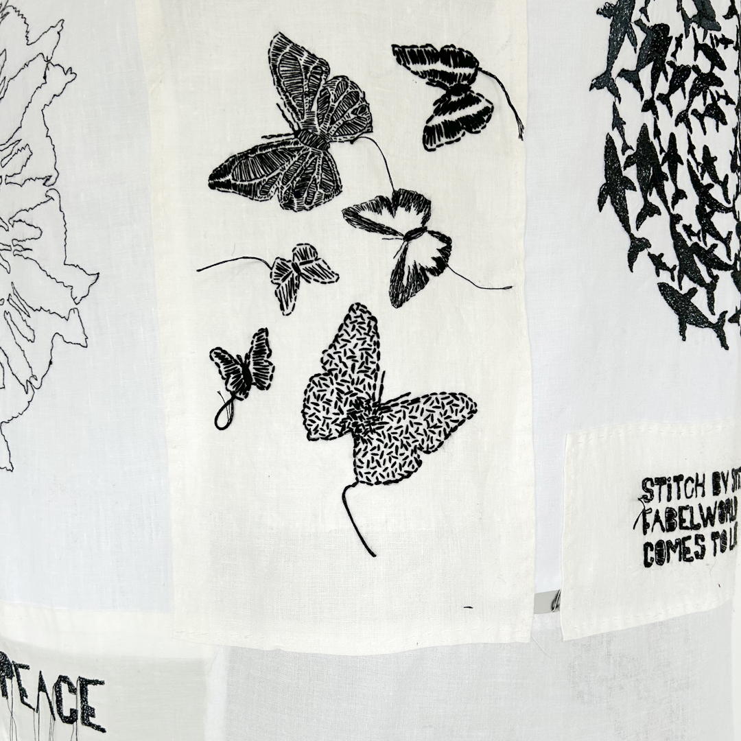De Sen Stitches installatie is een patchwork van lapjes en draadjes, mijn borduurwerk van de afgelopen dertien jaar. Steek voor steek doordrenkt met de woorden en waarden waar Fabel voor staat: schoonheid en liefde; vrijheid, en vertrouwen; verbinding en kracht. Met het vastleggen van intenties in draad wordt Sen Stitches een tastbare drager van hoop en vrede — een herinnering dat elke kleine handeling, elke steek, bijdraagt aan een groter geheel.