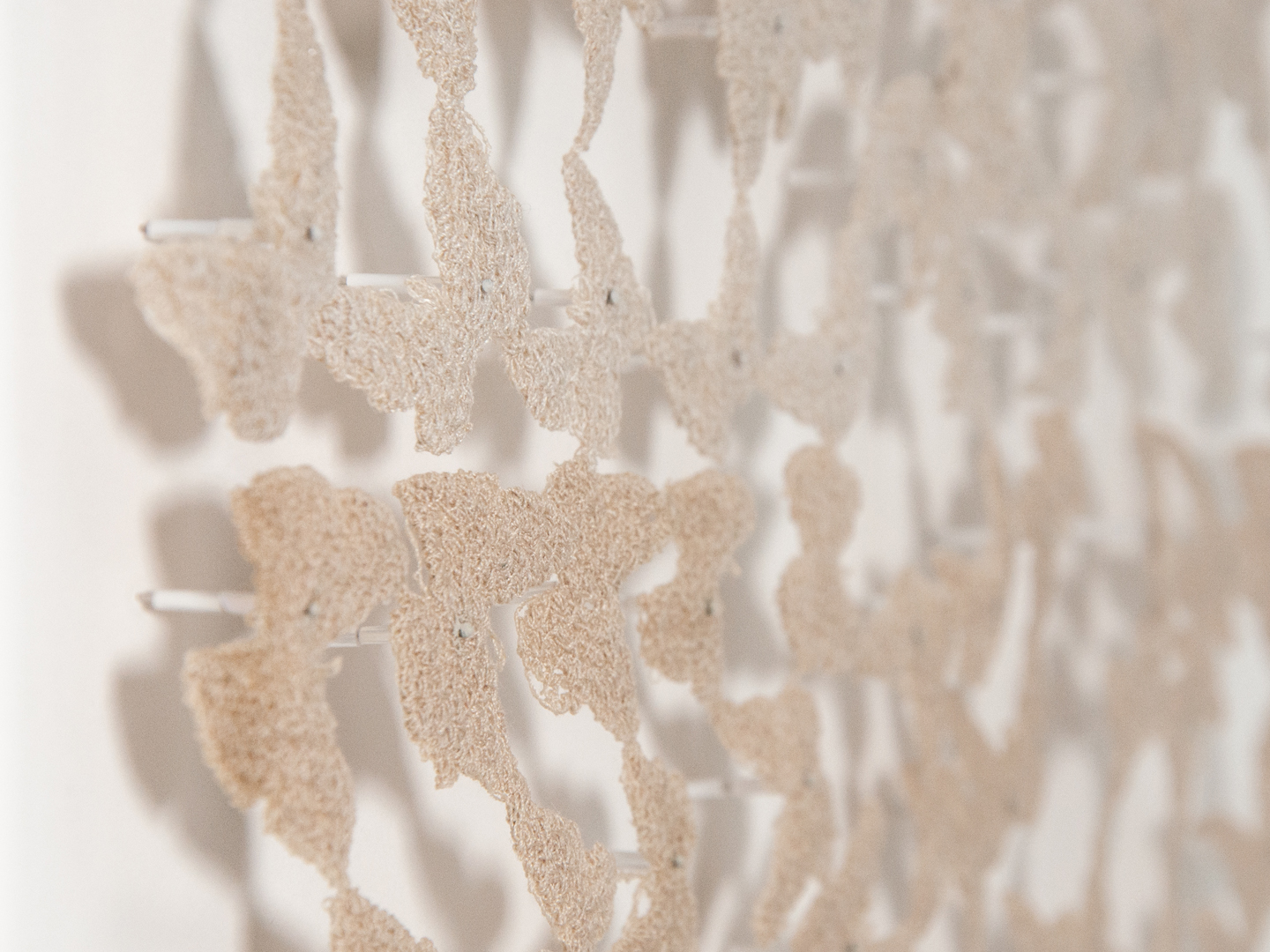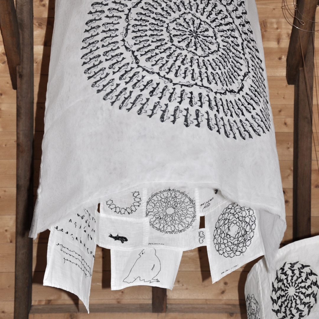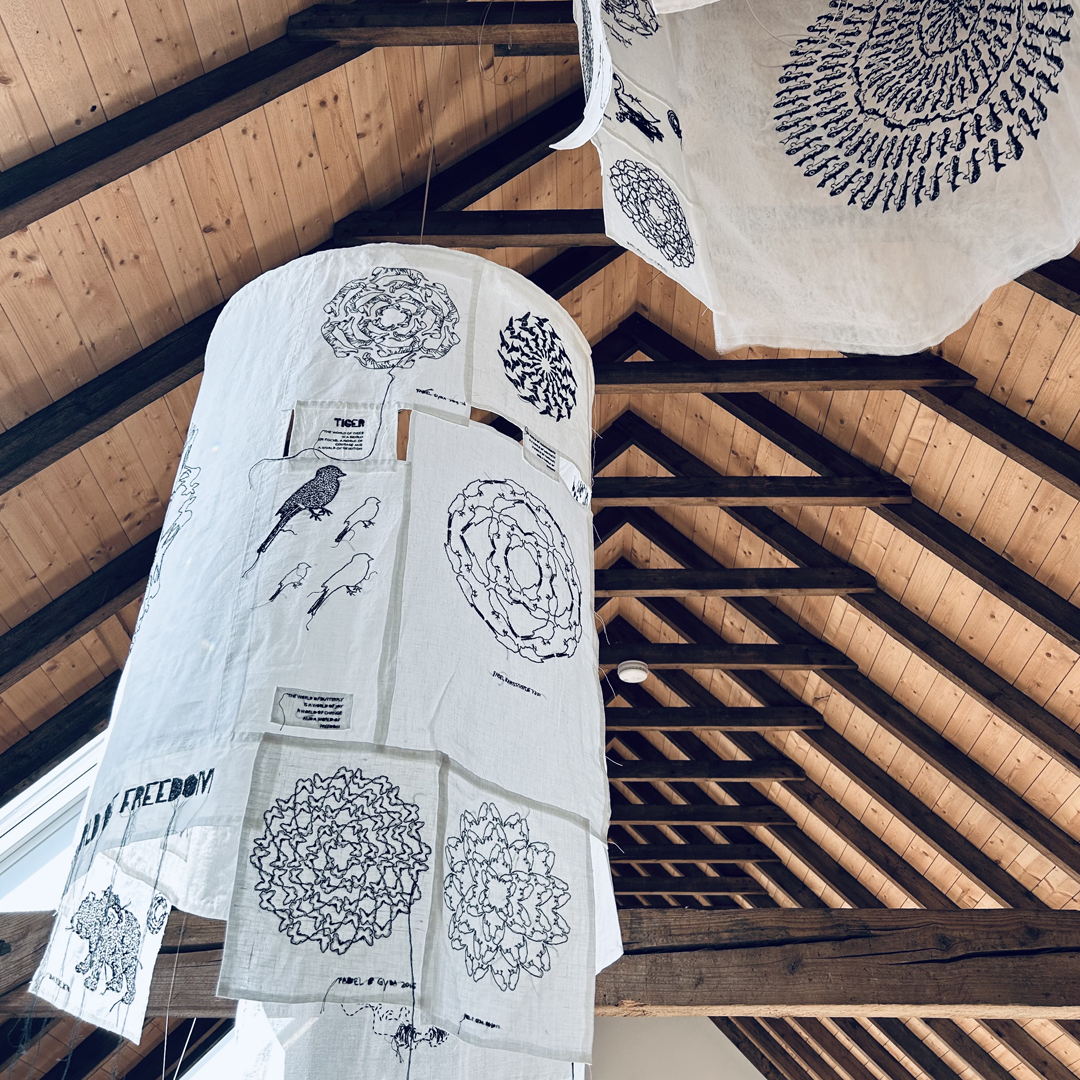 De Sen Stitches installatie is een patchwork van lapjes en draadjes, mijn borduurwerk van de afgelopen dertien jaar. Steek voor steek doordrenkt met de woorden en waarden waar Fabel voor staat: schoonheid en liefde; vrijheid, en vertrouwen; verbinding en kracht. Met het vastleggen van intenties in draad wordt Sen Stitches een tastbare drager van hoop en vrede — een herinnering dat elke kleine handeling, elke steek, bijdraagt aan een groter geheel.